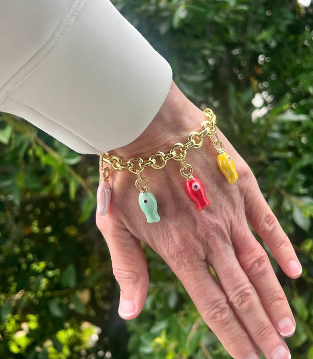 Made to pair with our Fish Tale Charm Necklace, this charming bracelet tells a colorful tale! Featuring five adorable fish pendants in a rainbow of pastel hues on a gold-filled chain, this piece adds a playful touch to any outfit. A perfect way to add a pop of whimsy to any outfit.