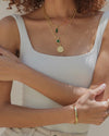 Gold filled detailed chain complete with a gold filled medallion featuring stars, moons and micro pave cz crystals.