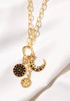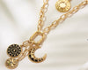 The stars align in this stunner! Gold filled link chain with a gold filled connector and 3 gold filled medallions, including an enamel moon, sunburst and a starburst.