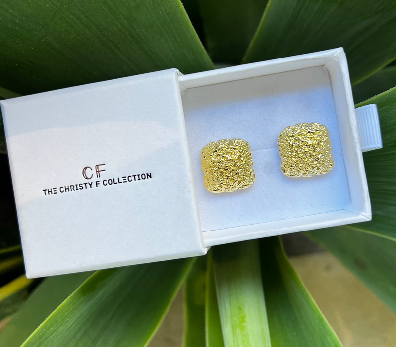 Embrace modern minimalism with our Textured Square Studs. These distinctive gold-filled earrings feature a bold square design with an intricate organic texture. They provide an effortless yet impactful statement for any occasion, from coffee runs to chic evening events. Lightweight and durable.