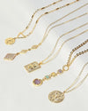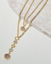 A stunning gold filled hammered style chain attached with a round rope connector, three multicolored gemstones surrounded by cz micro pave crystals and a gold filled pendant with a large lavender gemstone. A true statement piece created not only for Lulu but for you, too!