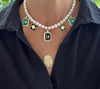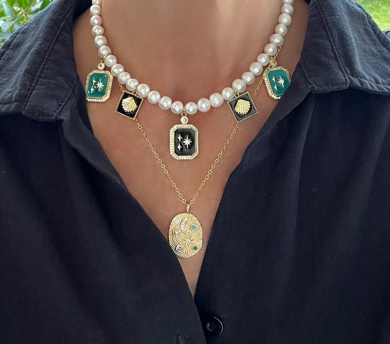 An oval shaped gold filled medallion brings an extra burst of flair with colorful gemstones and pearl designs amongst a cz micro pave moon and star. Certain to light up your night wherever you go!