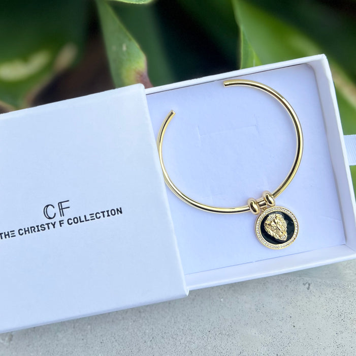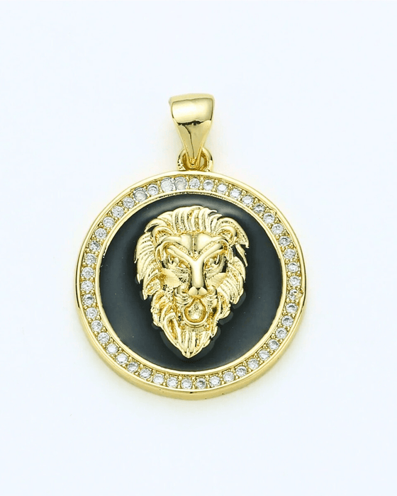 Gold filled lion medallion charm with black enamel background surrounded by cz micro pave diamonds.