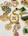 Gold filled round charm with cz micro pave crystals and a clear round gemstone.