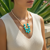 Transport yourself to the sun-drenched shores of the Greek islands with this chic statement necklace. A bold turquoise flower pendant takes center stage, framed by smooth cream shell beads that evoke the whitewashed villages and azure waters of Santorini. The adjustable gold-filled chain ensures a perfect fit for any neckline. Effortlessly hip with a touch of wanderlust.