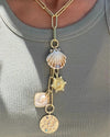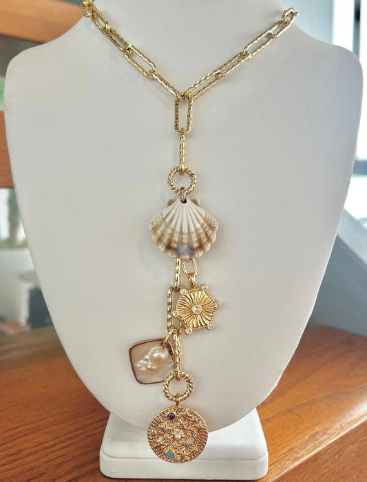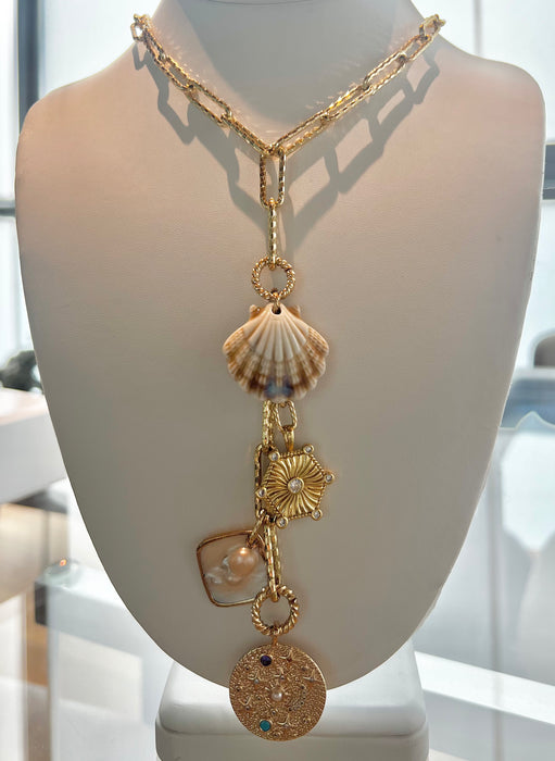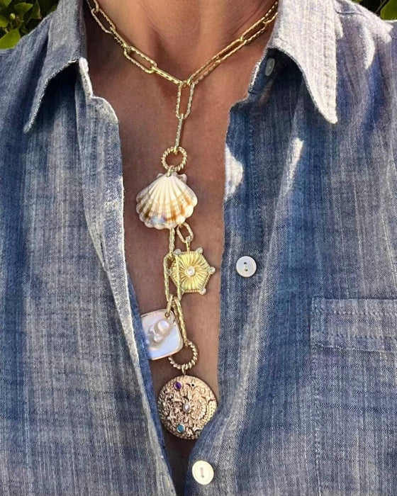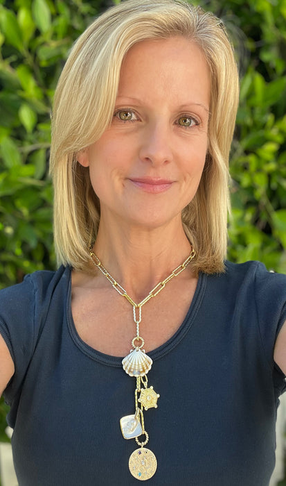 Seashells, sunshine and style: your beach day essentials. This gold-filled lariat style necklace is giving all the coastal vibes you'll ever need. Adorned with golden charms featuring clear & colored gemstones, a mother of pearl pendant & a vibrant shell charm, our bright & sunny necklace is effortlessly cool for sandy days & dreamy nights.